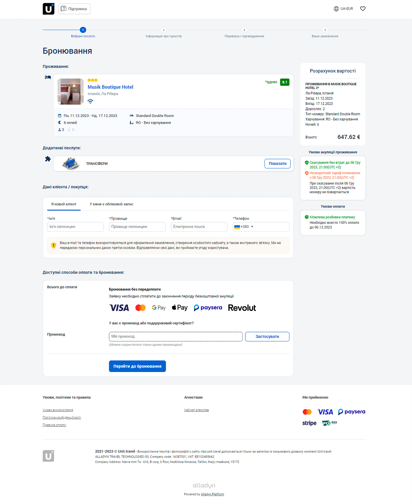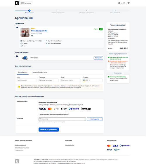 При першому вході або при першому онлайн-бронюванні клієнт створює свій обліковий запис у клієнтський кабінет. За допомогою кабінету ваші клієнти зможуть керувати своїми замовленнями, додавати необхідні послуги, оплачувати створені вами онлайн заявки, оновлювати свій профіль та документи..